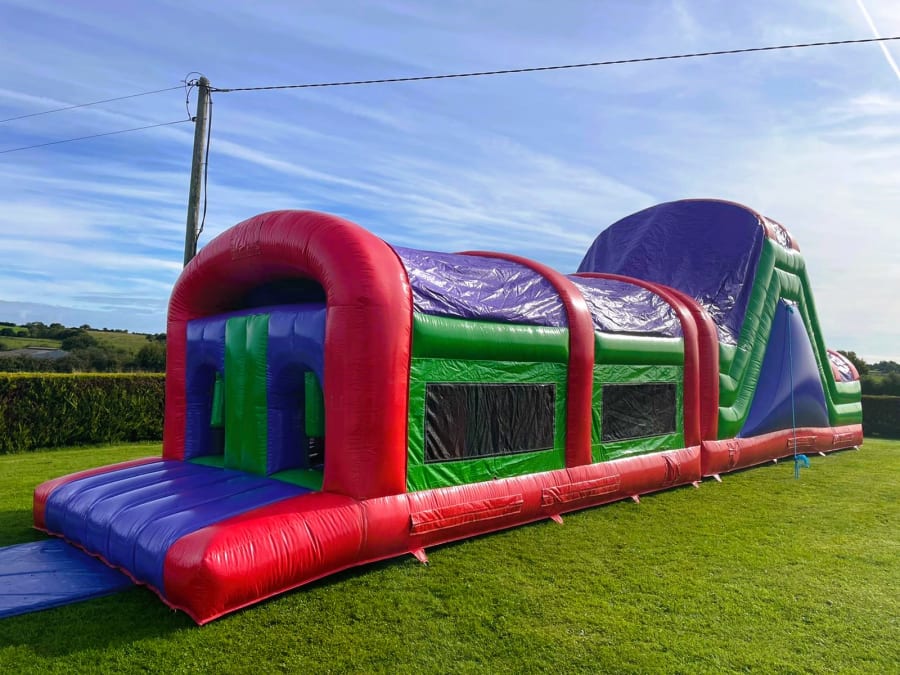 Our 50ft Thriller High Slide Obstacle Course is the ultimate choice for your party or special occasion. It is a truly gigantic obstacle course featuring a huge 10ft high platform slide, bish-bash area, obstacles, bouncing area and rock climbing wall. You won't be disappointed when hiring this obstacle course, it is a real head-turner with its multi-coloured design and massive size.