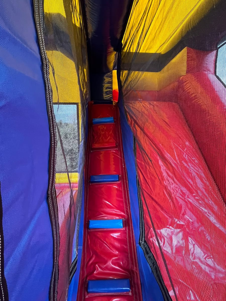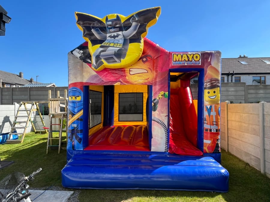 Our awesome Lego 3D Combi is a real head-turner and brand new for 2023! This combi unit consists of a large and spacious bouncing area and an 8ft high platform slide so the kids can bounce and slide all day long. It also features digitally printed Lego-themed artwork and a large 3D inflatable batman on top, which really makes the unit look impressive.