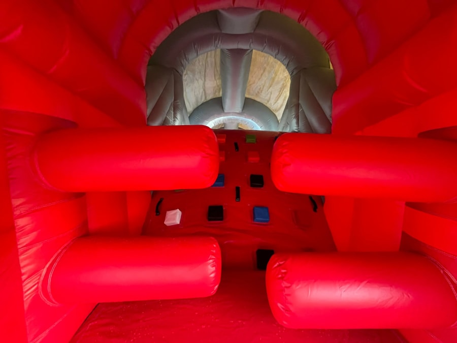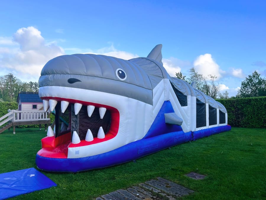 Brand new for 2023, this huge 50ft Shark Obstacle Course will be a real head-turner at any party or event. The excitement begins by just looking at this gigantic creature with its massive row of teeth (he doesn't bite, honest)!! The kids enter through the mouth up a rock climbing wall and down a 7ft platform slide into loads of obstacles. It is guaranteed to keep the kids entertained all day while letting their imaginations run wild!