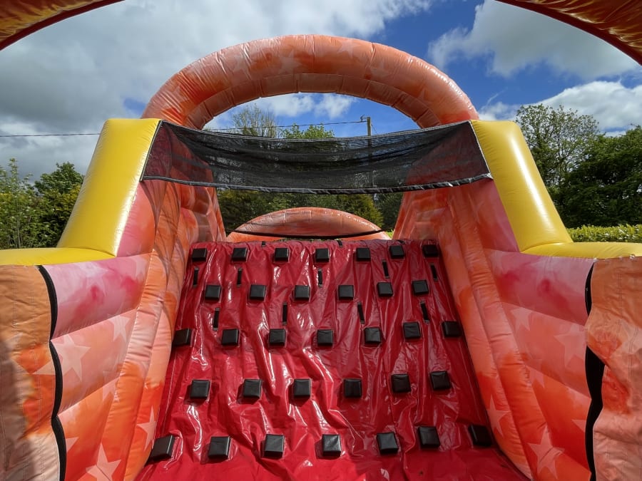 Our superb 47ft Colour Flash Obstacle Course is visibly striking to look at with its unique and colourful digitally printed artwork. There isn't an obstacle course like it anywhere else for hire on Mayo. Designed with older children and teenagers in mind, it features bish-bash areas, loads of obstacles, bouncing areas, rock climbing walls and a huge 7ft platform slide!