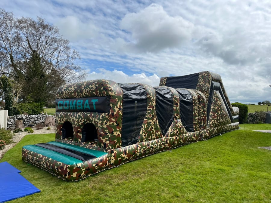 Test your abilities with our 42ft Combat Obstacle Course brand new for 2023. Want to challenge your guests with a head-to-head race? Then this combat camouflage-themed obstacle course is perfect! Participants start by diving through the two entrance holes, fighting through a series of obstacles until they reach the 7ft high climbing wall and down the slide to the finish line on safe ground! For EXTRA fun, you could also make it a relay race with two teams going head-to-head, the first team to have all its members complete the assault course and touch down on the safe ground is the winner.