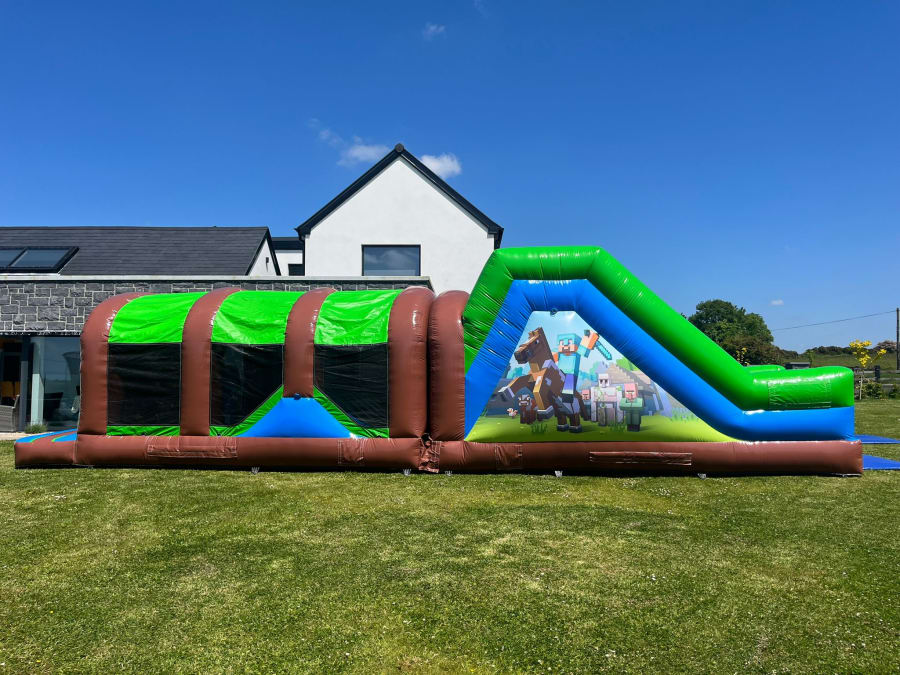 Introducing our new 42ft Minecraft Obstacle Course! Play, explore in our brand new for 2023 Minecraft-themed obstacle course, perfectly designed to entertain the kids and turn the neighbours heads. This awesome inflatable features artwork from the hugely popular Minecraft video game, making it a must-have for all the fans out there. Inside it contains loads of obstacles and climbing wall with a 7ft high platform slide.