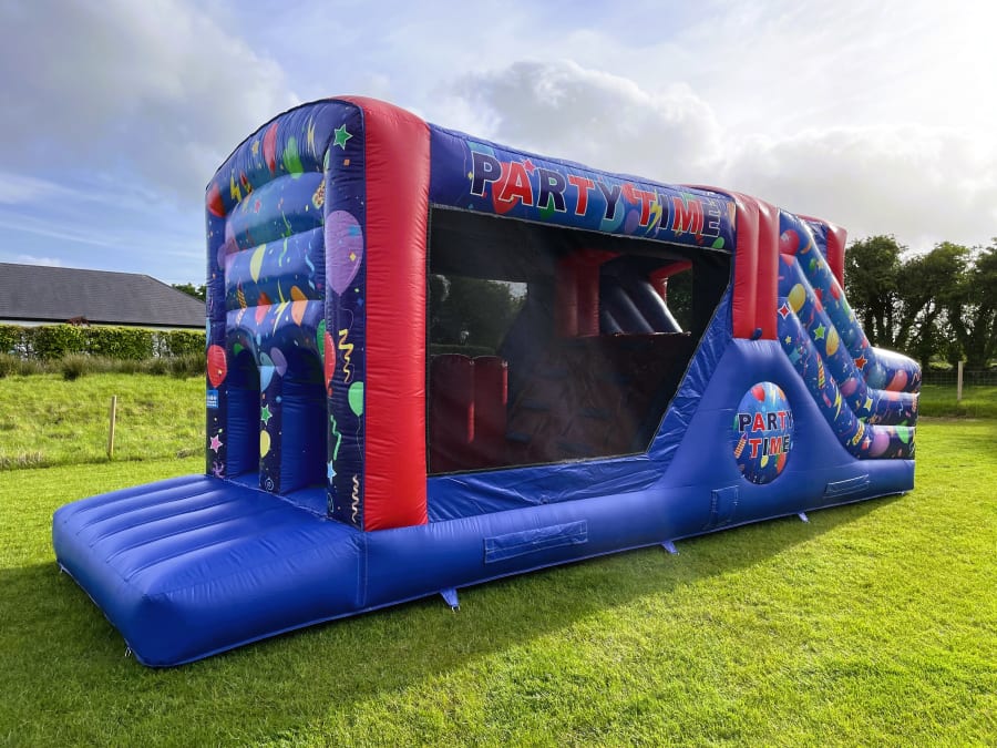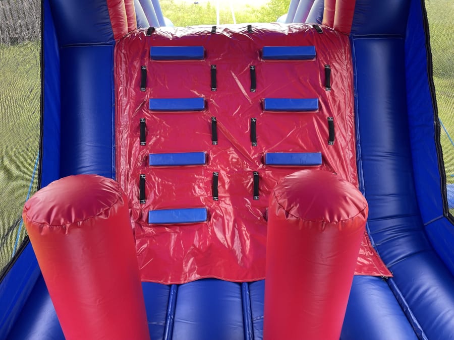 Our 30ft Party Time Obstacle Course is perfect for all party occasions and will be a big hit with the kids. Although it is the smallest obstacle course in our fleet, it is by no means any less fun. It comes with a 6ft platform slide, a spacious bouncing area with bish-bash obstacles and a rock climbing wall.