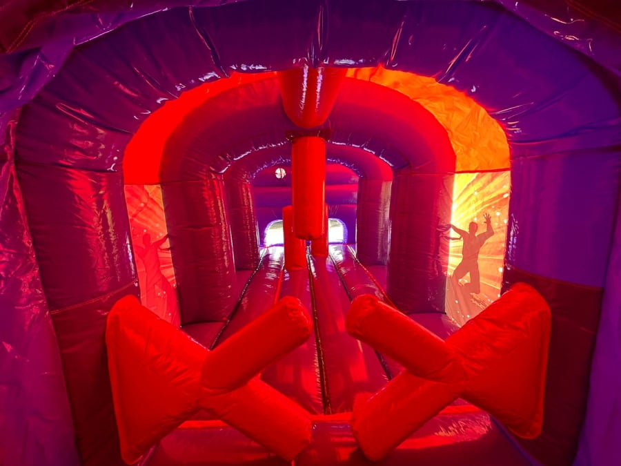 Introducing our 42ft Disco Club Obstacle Course, brand new for 2024! Featuring LED disco lights, a Bluetooth speaker for playing your favourite tunes, and eye-catching disco-themed artwork, this obstacle course will bring the excitement of a disco club right to your backyard party!